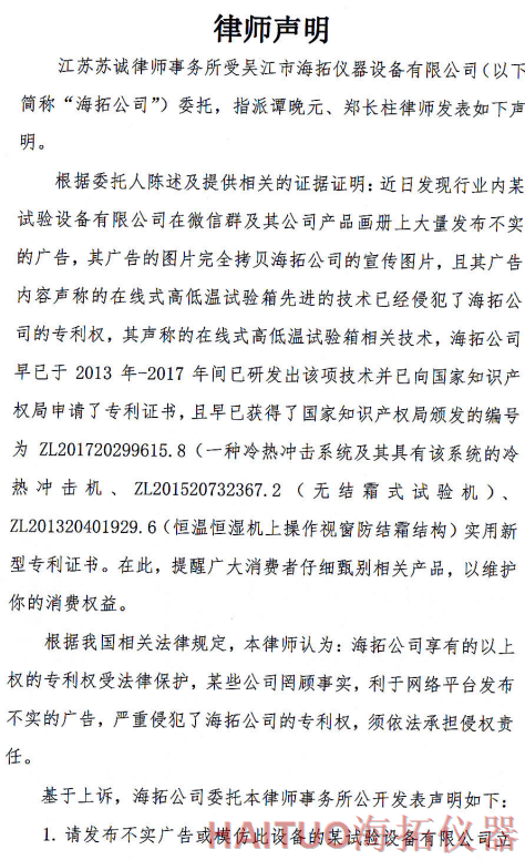 海拓儀器律師聲明:反對(duì)侵權(quán)行為 維護(hù)公司和消費(fèi)者權(quán)益摘要:國(guó)內(nèi)試驗(yàn)設(shè)備領(lǐng)先者吳江市海拓儀器設(shè)備有限公司委托律師事務(wù)所發(fā)布了律師聲明,該聲明指出,當(dāng)前市面上出現(xiàn)了產(chǎn)品專(zhuān)利侵犯海拓儀器權(quán)益,海拓儀器將以法律手段維護(hù)自身利益。該律師聲明要求某試驗(yàn)設(shè)備有限公司立即停止侵權(quán)行為,扯下其在網(wǎng)絡(luò)平臺(tái)的相關(guān)廣告和宣傳畫(huà)冊(cè)并同時(shí)停止生產(chǎn)同款設(shè)備。如果該設(shè)備公司不聽(tīng)勸解,海拓儀器將向人民法院依法起訴該公司侵權(quán)行為,以維護(hù)自身合法權(quán)益和維護(hù)客戶(hù)消費(fèi)權(quán)益,并建議廣大消費(fèi)者仔細(xì)甄別相關(guān)產(chǎn)品。? ? ? ?近日,吳江市海拓儀器設(shè)備有限公司委托律師事務(wù)所發(fā)布了律師聲明,該聲明指出,當(dāng)前市面上出現(xiàn)了產(chǎn)品專(zhuān)利侵犯海拓儀器權(quán)益,海拓儀器將以法律手段維護(hù)自身利益。??事件源起于海拓儀器發(fā)現(xiàn)市面上有同類(lèi)設(shè)備公司通過(guò)完全拷貝海拓儀器產(chǎn)品宣傳圖片,在微信群及該公司產(chǎn)品畫(huà)冊(cè)上大量發(fā)布不實(shí)廣告。??聲明指出,該廣告聲稱(chēng)的在線(xiàn)式高低溫試驗(yàn)箱的技術(shù)侵犯了海拓儀器的專(zhuān)利權(quán),該產(chǎn)品專(zhuān)利由海拓儀器 -